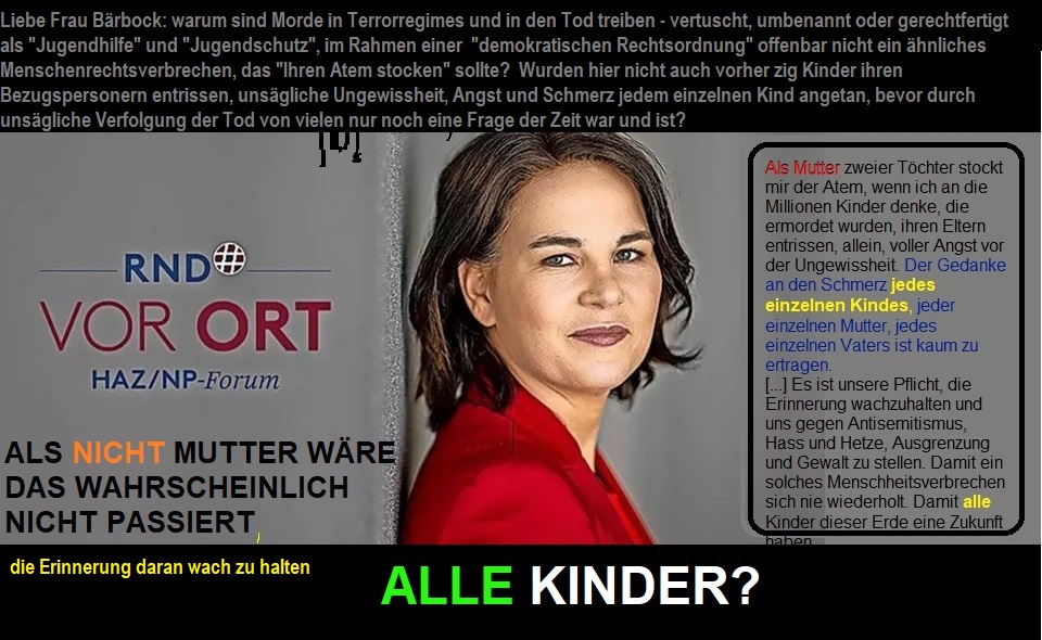 Nicht gehaltene Rede von Außenministerin Annalena Baerbock bei keiner Sondersitzung des Bundestags zum schon Jahrzehnte anhaltenden mörderischen Krieg gegen oppositionelle Kinder, Jugendliche und andere Entmündigte und Unterdrückte in Deutschland