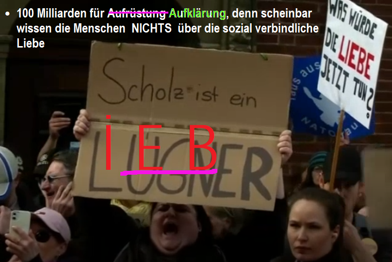 . Wer Frieden will, muss wissen, wie das geht. Wie man - wenn niemand mehr einen Krieg anzetteln kann- alle Menschen, wirklich ausnahmslos alle Menschen unter einen Hut bekommen kann, ohne dass sie sich gegenseitig bekriegen oder "auffressen". Wissen? Also BILDUNG oder wie? Bildung schafft Frieden? Welche Bildung? Welchen Frieden? Was für grandios viel "Bildung" haben wir schon geschluckt und trotzdem (deswegen?) so wenig sozialen Frieden und militärische Aufrüstung wie nie zuvor? Wir leben in unserem richtigen Leben, schon längst unter einer akadämischen Glocke, die uns alle droht zu ersticken. Jede-r will Abitur, keine-r will mit anpacken! Wie lange soll das noch gut gehen?