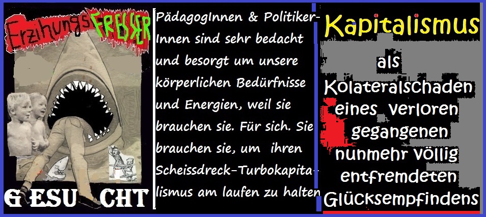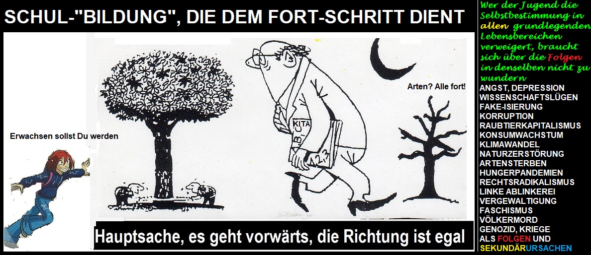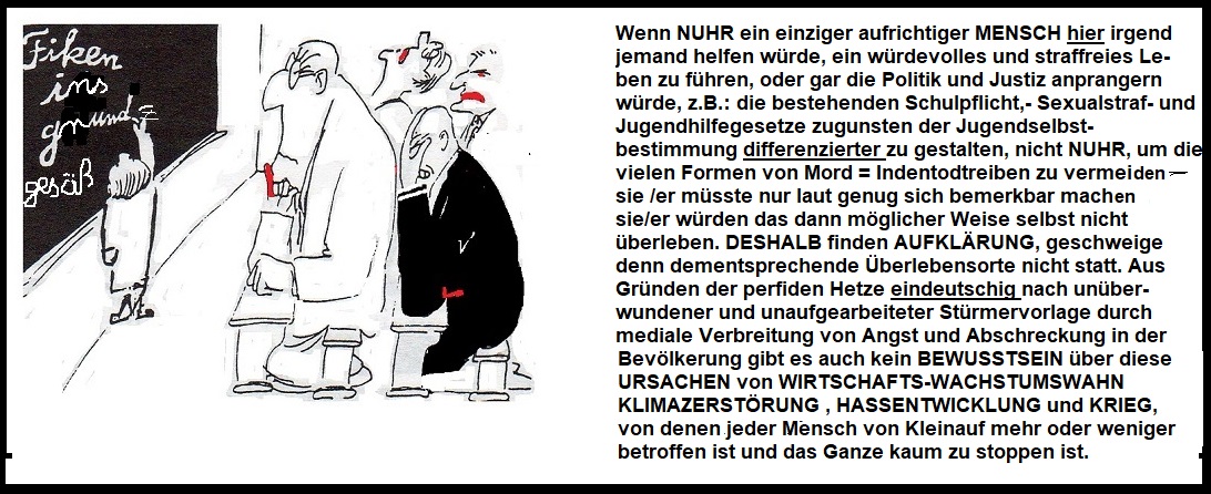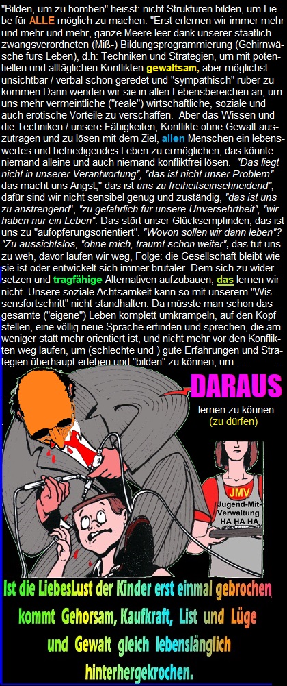Aber dann sich wundern, wenn einzelne schon heute Amok laufen gegen dieses gnadenlose und brutale - auf Selektion, Karriere, Konsum und Korruption ausgerichtete Lerninhaltesystem, um sich an ihm zu rächen, zwar mit den völlig falschen Mitteln- ohnmächtig wie sie sind - aber "immerhin" symbolisch -ein stets missverstandenes Zeichen zu setzen= ihren Versuch zu erkennen zu geben, - wenigstens für den Bruchteil eines Moments diesen zwanghaften Lerninhalteirrsin- zu stoppen. Denn kein Hass ist stärker, als eine gestohlene Freiheit und gestohlene Zeit der Erforschung, Entdeckung, dem Erleben und der Teilhabe an der kindlichern Lust. Dieser Ver-Lust ist wohl - wenn das massenmörderische P r o g r a m m des Erlernens von "polymorpher" E r s a t z b e f r i e d i g u n g als URSACHE bis hin zum kapitalistischen Wachstumsstreben, zur Klima-Umweltzerstörung, zum Krieg und Tod überhaupt jemals erkannt und von den öffentlich schier unkritisierbaren Verantwortlichen zugegeben werden würde- garantiert nicht mehr korrigierbar, geschweige denn reparabel und umkehrbar.