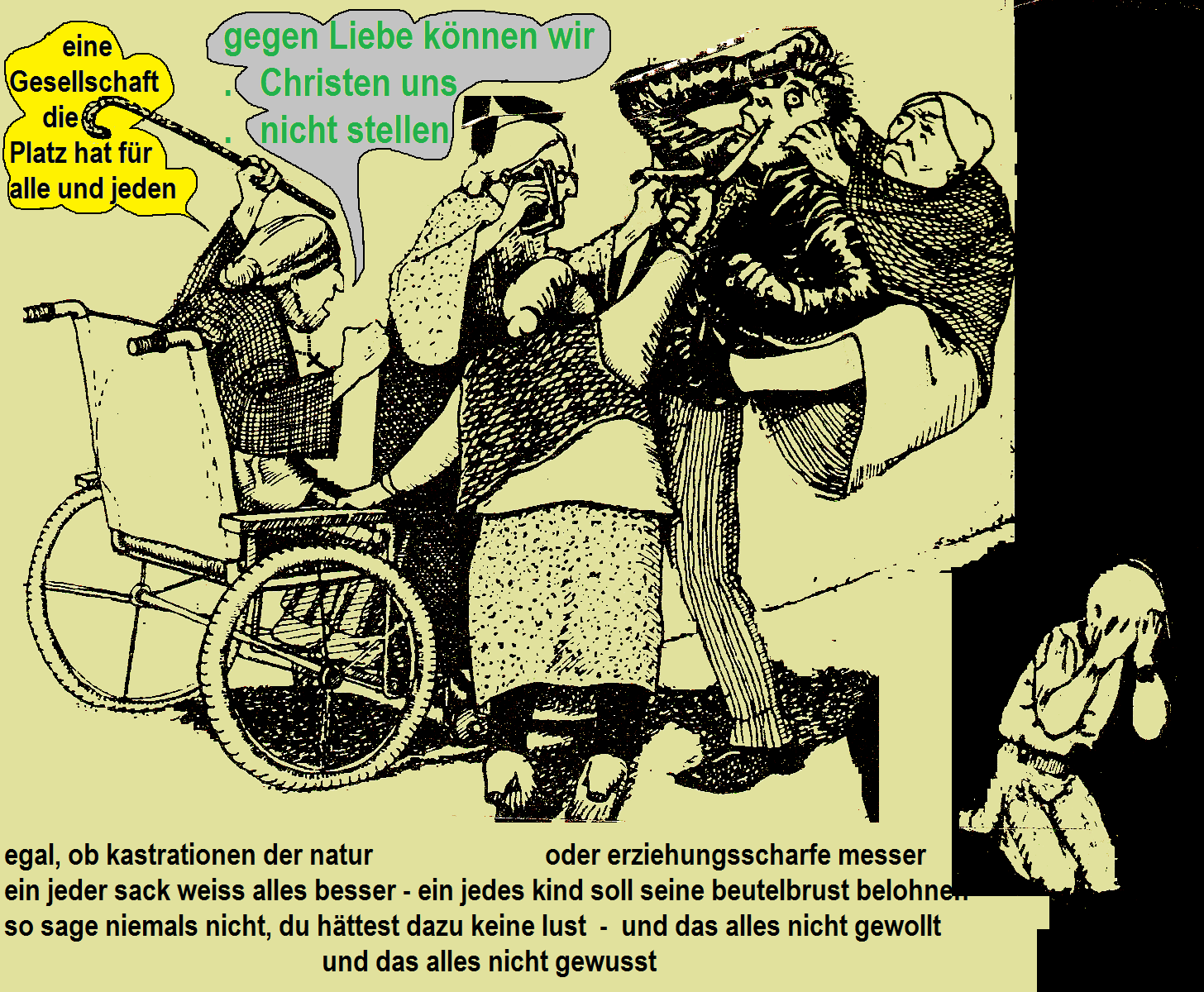 Es geht um die Motivationen, die es in dieser angeblich freiheitlichen, toleranten Demokratie, nicht gibt oder nicht geben soll: Ungebildetheit über diese Themen, Neid, Hass, Missgunst, Eifersucht, Profitgier, Angst, Gewalt, Arroganz, und um die Ablenkung von den Eichen, die sie in ihren Kellern versteckt haben. Zurück zu ihren Gesinnungsgenossen: Wenn man sich umhört, warum die viel beschworene Kommunikation zwischen "falschen" Christen der P e g i d a und politisch sich "nur richtig" verhaltenenen "n ä c h s t e n l i e b e n d e n "Christen und den paar wenigen F e r n s t e n l i e b e n d e n, die es gibt, nicht funktioniert, erlebtt man die knallharte Realität: "Man liebt eben nur den, der sich (zum )lieben (finden) lässt"- und bei dem verharrt man, lässt sie /ihn /es nicht mehr los. Und dann ist erstmal die Türe zu. Nennt es: "meine Familie". Lustig oder ? Die Sichtbarkeit dieses Gefängnisses: arbeiten für die eigene Familie, die eigene Ersatzfamilie, die "eigenen" Kinder? Jeder macht das, jeder macht damit globalsozial gesehen-schon den gleichen Fehler- egal, auf welcher Seite sie /er steht. Jeder, der kann, macht es so, Punkt und Schluss. Aus Maus, Ende, Mord. Ein Massensport. Wer wird das nächste Terror-Opfer Art in dieser Art Volksverhetzungssport sein, diejenigen platzumachen, die versuchen diesen Gefängnissen- samt ihren legalisiert angebotenen Alternativen- zu entfliehen ? EINWANDERUNGSPOLITIK? KONKURRENZTERROR_POLITIK: DIE RIVALITÄT DER BETROFFENEN IST VORPROGRAMMIERT: DIE KONKURRENZFAMILIE_IST AN DER MACHT die Zeit; Raum, Geld, Befriedigung ihres separatistischen Verlangens gegenüber anderen EBENSOLCHEN für sich beansprucht. Dieser Wen_ man_ nicht_ kennt, _wie _kann_ man_ den _lieben-Sport- degradiert schon den übernächsten- und die Fernsten sowieso- in die sozialarbeiterische Kategorie, in die fürsorgliche Umklammerung und wenn es nach ihnen geht, in den millionenfachen Tod REAKTIONEN? Ein "liebender" Schwanz passt immer nur in ein Loch. "Drück das mal nicht so drastisch aus, wir sind doch DIE GUTEN: Man kann doch nicht alles Leid auf der Welt absorbieren und abschaffen, man kann es nur verdrängen!" Auf diese Weise wird die "Nächstenliebe" zum Fernstenausschluss und zum Fernstenhass. Obwohl es sehr wohl Konzepte gibt, die a l l e Menschen mit allem Überlebensnotwendigem- auch Liebe-versorgen. Doch das lässt eine grundsätzliche Hinterfrage der apokalyptisch- egoistischen -antisozialenfamiliären Nächstenliebekonzepte dringend notwendig erscheinen .