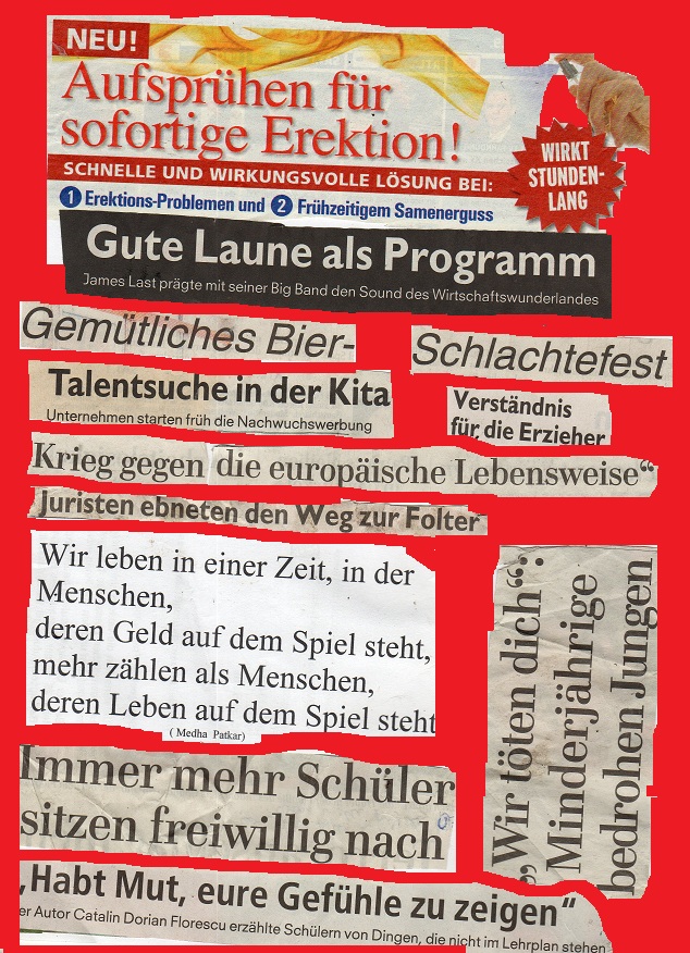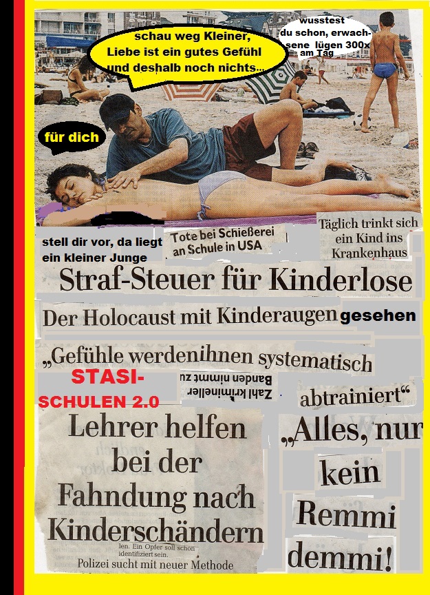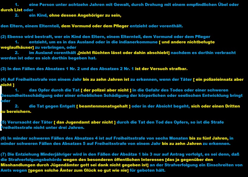 "Ja liebe Leute, wir sollten die Flüchtlinge aus den Erziehungsfolterkammern der Nation endlich an-erkennen. die Fehler, die wir in den vergangene Jahren und Jahrzehnten mit Flüchtlingen aus Heimen und Psychiatrien und anderen Sammellagern gemacht haben, sollten wir nämlich nicht wiederholen. Lassen wir sie also weiter, ich meine natürlich nicht, vielleicht noch viel heftiger und grausamer um ihr Leben vor den Auf-fangbehörden rennen bitte. Und noch etwas, liebe MitwürgerInnen und Mitwürger: Deutschland wird noch viel freiwilliges ehrenamtliches Engagement brauchen, um die vielen Flüchtenden bei ihrer Flucht aus Kinderheimen, Betreuerwillkür, Altenheimen, Jugendämtern, Asylantensammellagern, Psychiatrien und behinderten Werkstätten zu hindern, äh ich meine zu helfen und einen Platz zu schaffen, wo sie nach ihren Vorstellungen und Gefühlen leben können ohne Angst und Repression. Wenn das aber über Jahre und Jahrzehnte so weiter geht mit unserer Ignoranz und Kriminalisierung nach Paragraf 235, , wie wir das zum Beispiel auch gegenüber der Indianerkommune mit grossem Er-Folgen schon gemacht haben" ,"sagte sie, "wird das Land eines Tages an der Last der grossen Flüchtlingsströme aus deutschen Zwangseinrichtungen und oft auch pädagogischen Folterkammern ohne Zweifel zusammen brechen oder ab-saufen , je nachdem