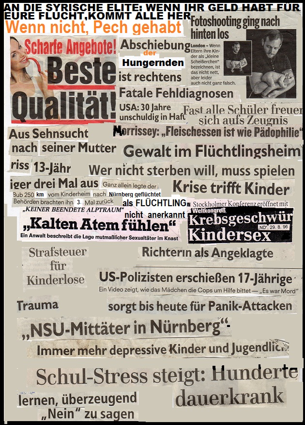 Und warum kommen sie? Weil sie alle nur allzugern an der Verwirklichung eines grundlegenden revolutionären Metapherwechsels von wirtschaftlicher Wachstumsexpansion hin zu einer Dominanz des Sozialität spendenden erotischen Hilfsbereitschaftsgedankens mitwirken möchten. Nichts ersehen sie mehr, als Menschen ausserhalb ihrer angehörigen Sippschaften zu unterstützen und zu lieben. Schokoladenfabriken und Teddybärunternehmen, KItaindustrie und Wohungsmarkt haben bereits tat-kräftig protestiert ich wollte sagen, applaudiert, ihre himmelbraune Mitarbeit signalisiert, und bereits die ersten Köpfe dieser neuen Arbeitmachtfrei-Bewegung rollen , ich meine probieren lassen, ob wir nicht alle noch ein bißchen mehr stress- und kriegsvermarktet werden könnten, weil die Traumapsychologen brauchen ja schliesslich auch Arbeit, immerhin gibt es ja dieses Jahr schon wieder einen neuen Uni-Abgangs-Rekord. Auch die Autofabriken und Schulbücherindustrie haben schon ihre freudliche Breischaft erklärt, an der Antiaufklärung der Flüchtlinge mitzuwirken, frei nach dem Motto: "nur wer konsequent nicht mehr zur Schule geht, kommt erst gar nicht auf die Idee, seinen kriegsgewinnlerischen Besitz mit anderen teilen zu müssen, eben weil keiner einen solchen mehr hat, und kann sich so mit den Flüchtlingen wirklich identifizieren, solidarisieren und sie auch in Betten ihrer vergoldeten Schlafzimmer schlafen lassen, während sie selbst -die grosskopfern, freiwillig wie verkrätzte Hunde auf den Fussböden ihrer armseeligen Fabrikhallen schlafen wollen. Ausserdem erklärten sie, zukünftig ihre Produkte kostenlos zu produzieren oder gar nicht mehr und dazu aufzurufen, den von ihnen kostenlos verteilten konsumterroristischen Erziehungsgewalt-Lockmittel-Scheissdreck auch an und auf zu kaufen und in ihren Einkaufscentern anzubieten, bzw. diesen Gedanken mit allen weiteren ankommenden Flüchtlingen in simpler konsumhysterie zu teilen :