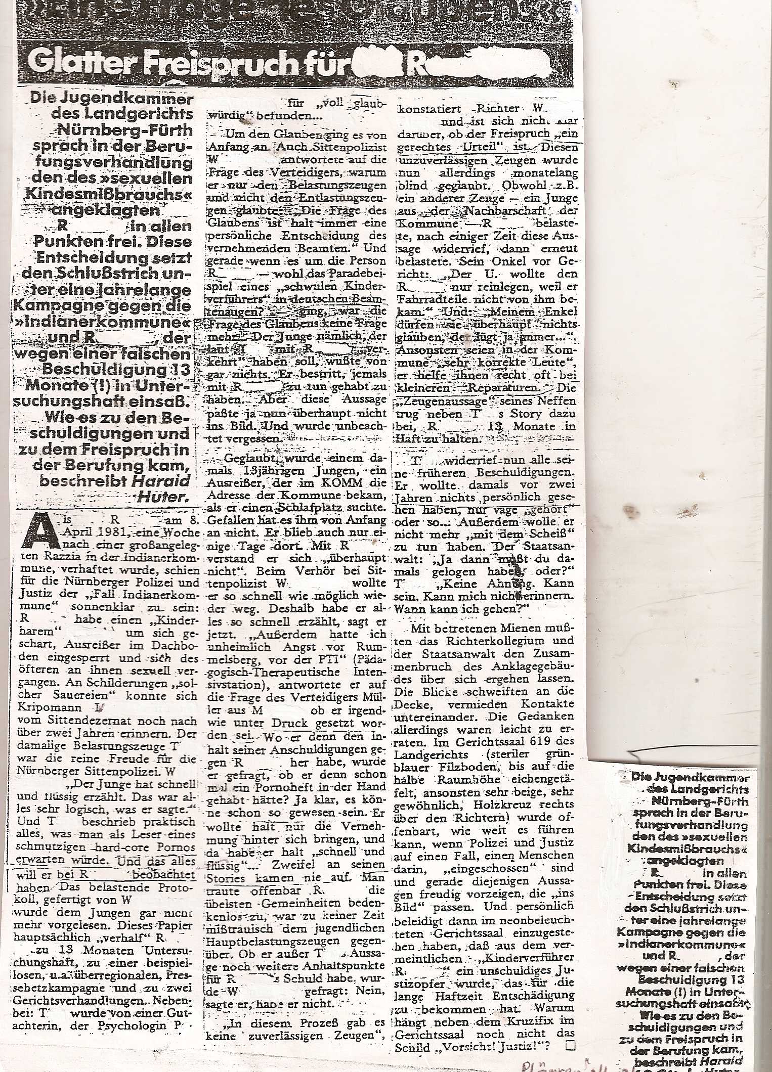 um die kinderrechtesache klein zu kriegen ,denn wir wurden zu frech und klagten zu viele skandale von hohen tierchen insbesondere öffentlich an, deshalb die überlange u-haft. dann freispruch 17. klasse. für was? dafür dass ich die mir berichteten offensichtlichen misshandlungen in der PTI rummelsberg publiziert hatte u.a. plus gutachterterror, plus eine zynische richterin, die später von ihrem eigenen ehemann ermordet wurde, plus ein karrieregeiler staatsanwalt, plus ein psychiater, plus medienpranger, plus sämtliche persönlichkeitsrechte wegFOCUSiert, und knapp 3 tage wasserentzug beim hungerstreik im knast, um den zu hungerstreik zu brechen, was bedeutet, daß ich fast ins gras gebissen hätte. das bin ich bis heute nicht los. ich habe früher nie an traumata geglaubt aberdas ist eins. trotzdem blöken die medien mal wieder aus allen rohren, wie sie nur können. pädophilie pädophilie ja ja und blabla bla. aber zu diesen jugendamtsganoven da schweigen sie, wie die axt im wald, die sie sindbildlich imprinzip auf die köpfe der kinder richten, die verzweifelt versuchen, den abholzaktionen ihrer besitzerInnen zu entkommen