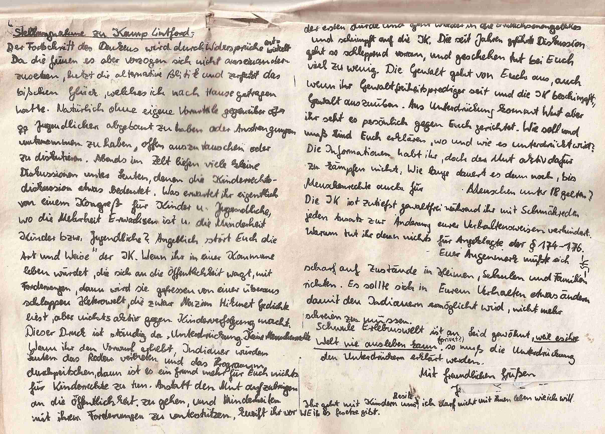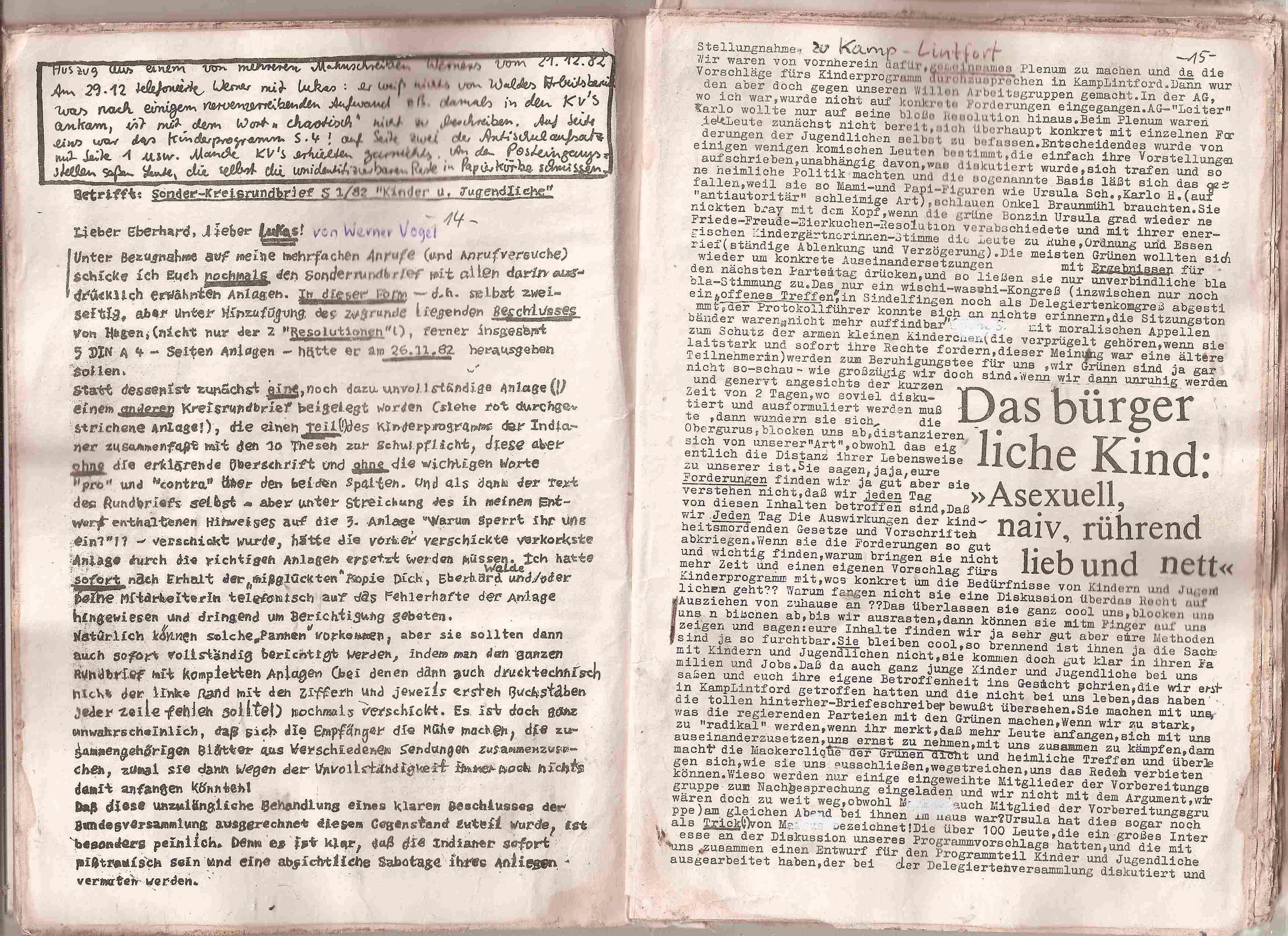Nicht mal heute will man unsere Dokumente wahrnehmen. Die gesamten Details werden mit der "Pädophilie-Keule" erschlagen. Hier gibt es zahlreiche Stellungnahmen betroffener Jugendlicher, die aufzeigen, welchen schmierigen agressiven Erbrechenswahnsinn die GRÜNEN Pädagogen, in heeren Massen von der Partei mobilisiert nach Kamp-LIntfort, der Jugend-AG angetan wurde. Kamp -LIntfort war die letzte Chance der Grünen Pädagogen, das für sie "schlimmste" zu verhindern und sie nahmen diese Chance wahr. Die Behandlung der Jugendlichen seitens der GRÜNEN Pädagogen wurde komplett unterdrückt und verschwiegen. Zu diesem Zweck dokumentieren wir hier den gesamten Rattenfänger "83/84, zweite Fassung, das detaillierte Programm, wie es sich nach dem Kongreß darstellte, findet sich hier:
