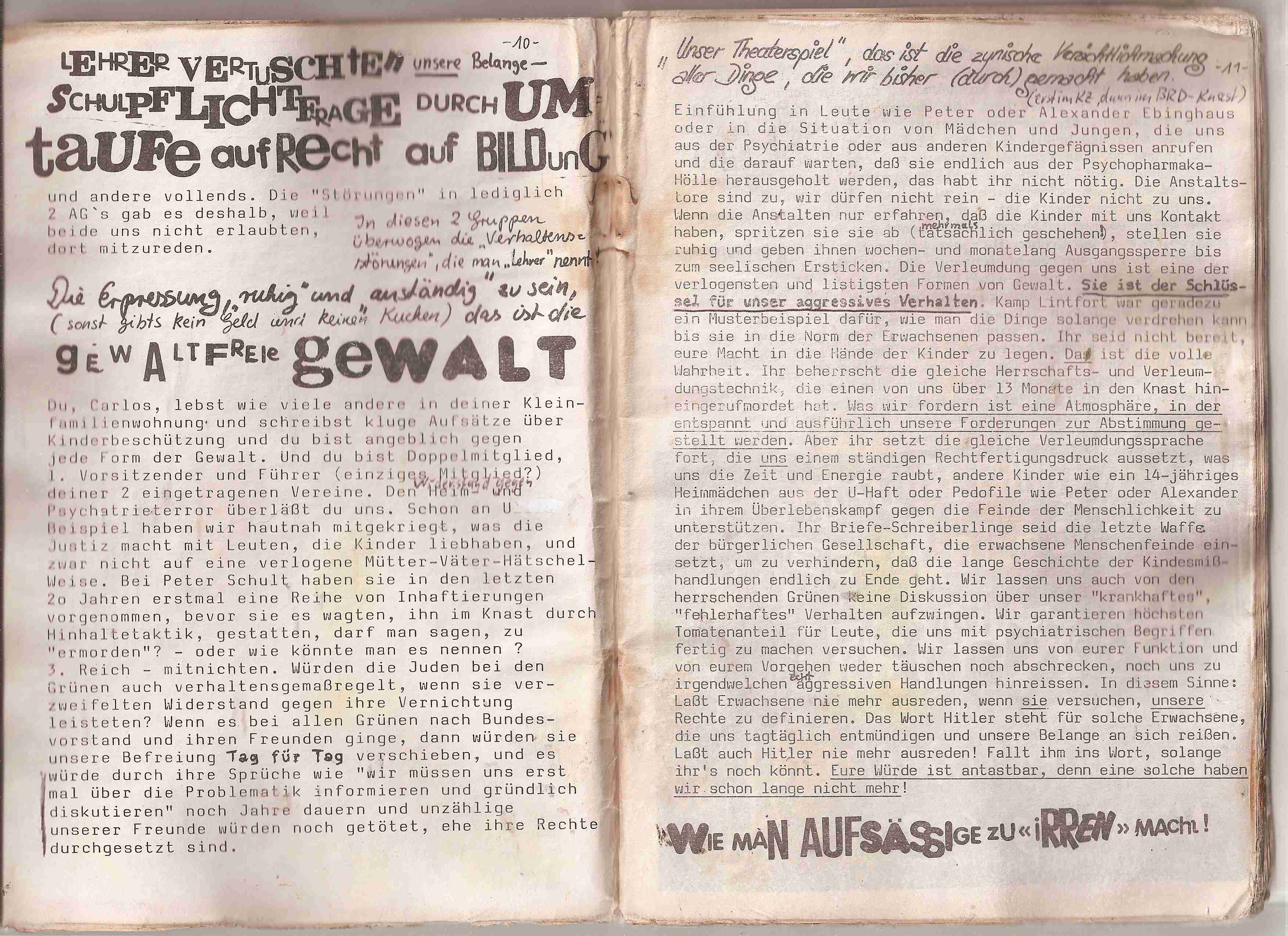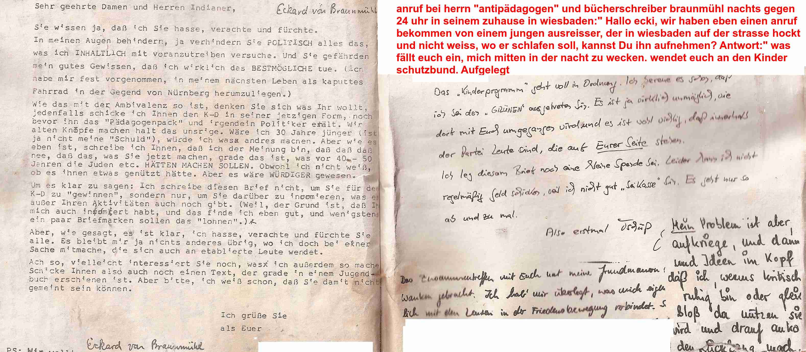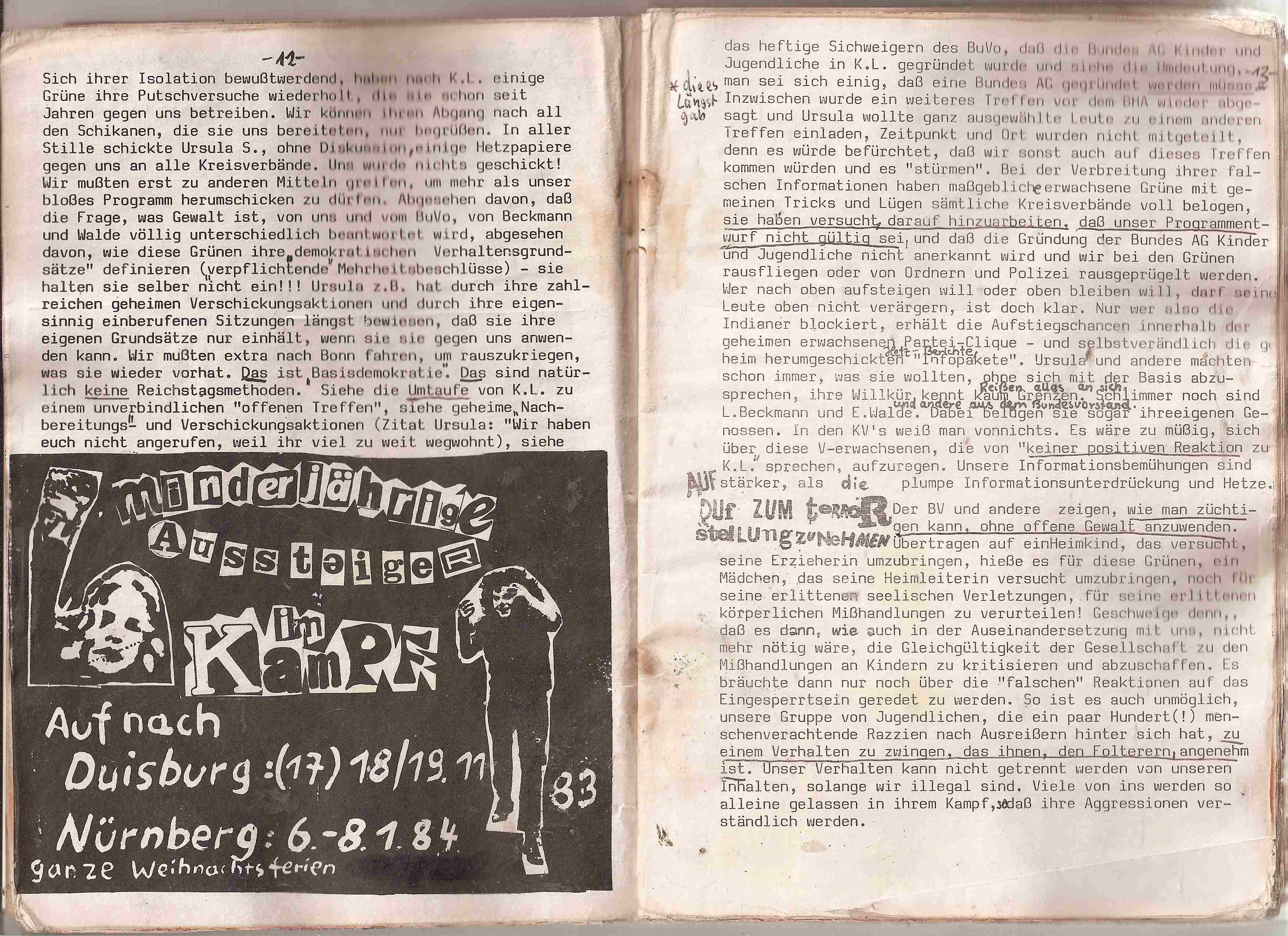 Nicht mal heute will man unsere Dokumente wahrnehmen. Die gesamten Details werden mit der "Pädophilie-Keule" erschlagen. Hier gibt es zahlreiche Stellungnahmen betroffener Jugendlicher, die aufzeigen, welchen schmierigen agressiven Erbrechenswahnsinn die GRÜNEN Pädagogen, in heeren Massen von der Partei mobilisiert nach Kamp-LIntfort, der Jugend-AG angetan wurde. Kamp -LIntfort war die letzte Chance der Grünen Pädagogen, das für sie "schlimmste" zu verhindern und sie nahmen diese Chance wahr. Die Behandlung der Jugendlichen seitens der GRÜNEN Pädagogen wurde komplett unterdrückt und verschwiegen. Zu diesem Zweck dokumentieren wir hier den gesamten Rattenfänger "83/84, zweite Fassung, das detaillierte Programm, wie es sich nach dem Kongreß darstellte, findet sich hier: