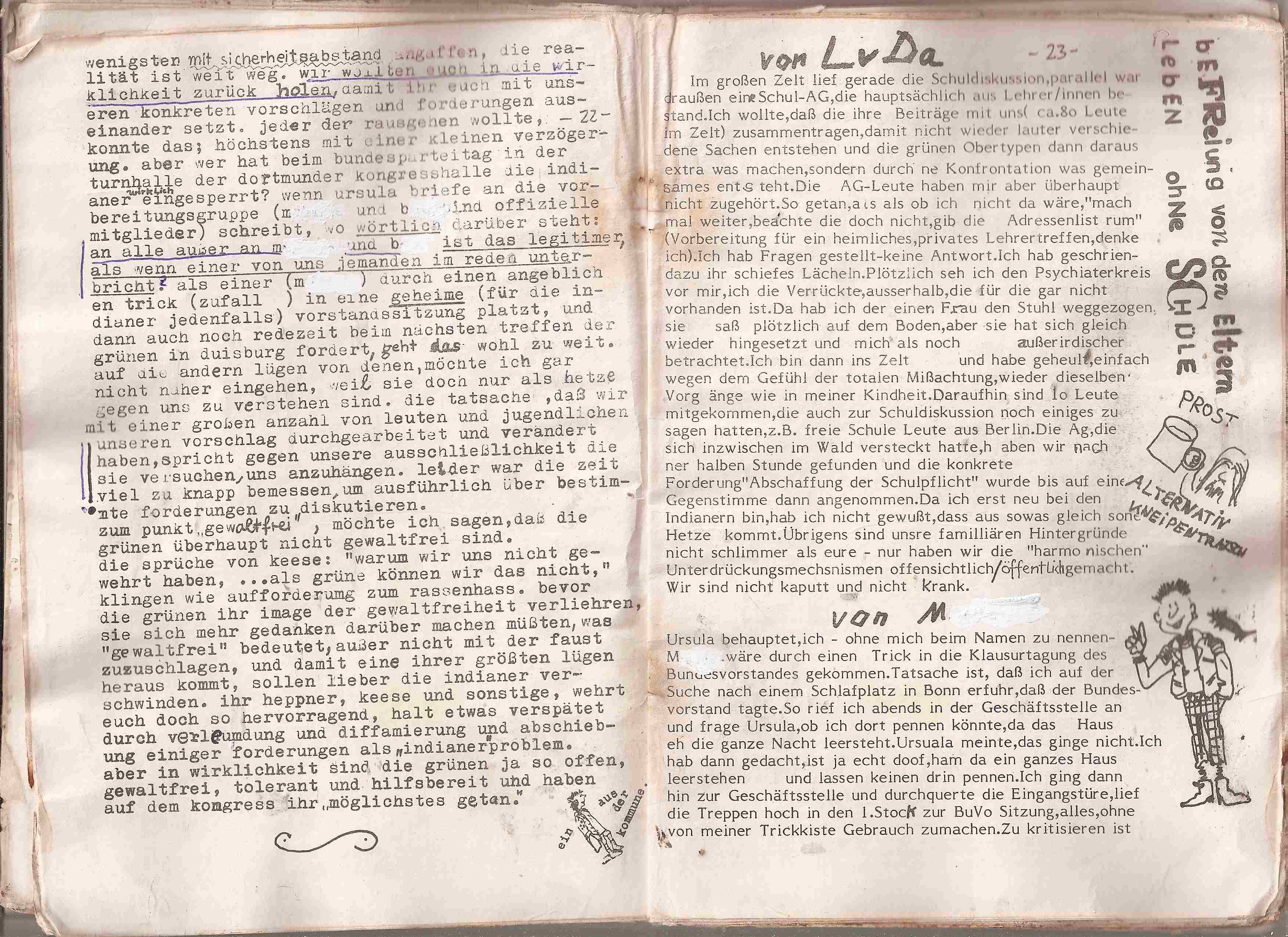 Nachdem wir stundenlang im blöden Bundesbonzenhaus darum kämpfen mussten, dass bitteschön unser Rattenfänger und alles, was mit Kamp-Lintfort zu tun hatte, an die Deligierten und alle Kvs vorm Duisburger Bundesparteitagverschickt wird usw. , kommen wir nach Hause und finden schon wieder ein neues Papier von U. Schwarzenberger vor, was sie an „alle Teilnehmer von Bonn“( P., der nicht in Bonn war, kriegte auch eins) mal eben ganz „privat“ mit Überschrift s.o. verschickt. In diesem Papier vertuschte Ursula die Ergebnisse unseres Treffens mit Leuten aus der GRÜNEN Fraktion, als ob es nie gewesen sei. Tenor Ursula: „das Nichtvorhandensein von Kindern und Jugendlichen in Kamp Lintfort geht wohl zum weitaus größten Teil gerade aus den Erfahrungen der Kvs mit der Indianerkommune selbst hervor.“ Der Fall, daß ein Junge, der mitfahren wollte, nicht abgeholt wurde, sei laut Ursula nur ein “Einzelfall“ gewesen. „Ich wusste von nichts“.Ursula wollte die ganze Zeit durchsetzen, daß unsere Rattenfängerzeitung höchstens auf der Literaturliste bei den Materialien zum Kamp Lintfort erscheint. Beim Treffen mit der Fraktion wurde beschlossen, daß der Rattenfänger vor dem Duisburger Parteitag an alle Kvs und Deligierten verschickt wird. In ihrem Brief schreibt sie wieder:“ daß jetzt der Rattenfänger ebenfalls in dieser Materialliste mit aufgeführt wird und bei der Fraktion bestellt werden kann, halte ich für einen richtigen Beschluß des gestrigen Tages.“ Diese Art ist genau die Fascho-Linkerei, die schon zu lange läuft. Sie schreibt noch, daß erst nach Duisburg verschickt werden kann, “weil der Drucker überlastet sei“!!! Doch wir hatten vorher angeboten, den Rattenfänger in Nürnberg oder Bonn selbst zu drucken, zu legen usw. Für Ursula ist alles klar, sie hat ihre Weisungen aus dem Bundesvorstand durchzupowern, egal was Fraktion und Treffen entscheiden und wir dabei draufgehen. In Bonn wurde festgestellt, daß die Bundes-AG Kinder und Jugendliche besteht, diese braucht keine Absegnung von Mamma Ursula. Trotzdem erklärt sie ein solches Treffen für völlig übereilt. Ursula stellte in ihrem Brief weiter klar, was sie meint, wenn sie uns als „nicht normal“, und „unnormal“ bezeichnet. Auf jeden Fall sind alle Mitglieder der Kommune schon normal, also intelligent, klug usw., aber das Anfordern von Adressen und das „kaltschnäuzige“ Veröffentlichen von „privaten“ Briefen ist nicht menschlich und bei denkenden Menschen unnormal. In einem Telefongespräch, in dem sie sagte, „der Rattenfänger“ wird nicht verschickt, (trotz Absprache mit der Fraktion) ließ sich U. zu folgendem Satz hinreissen:“ ich, Ulli R. habe die Befürchtung, daß es zu einem großen Unglück kommt, wenn der Rattenfänger nicht verschickt wird“.Sie fasste das als Bedrohung auf und gabes weiter an den Bundesvorstand. Der BUVO wird dann schon das richtige machen und beschließen, diese Bedrohung endgültig zu beseitigen.