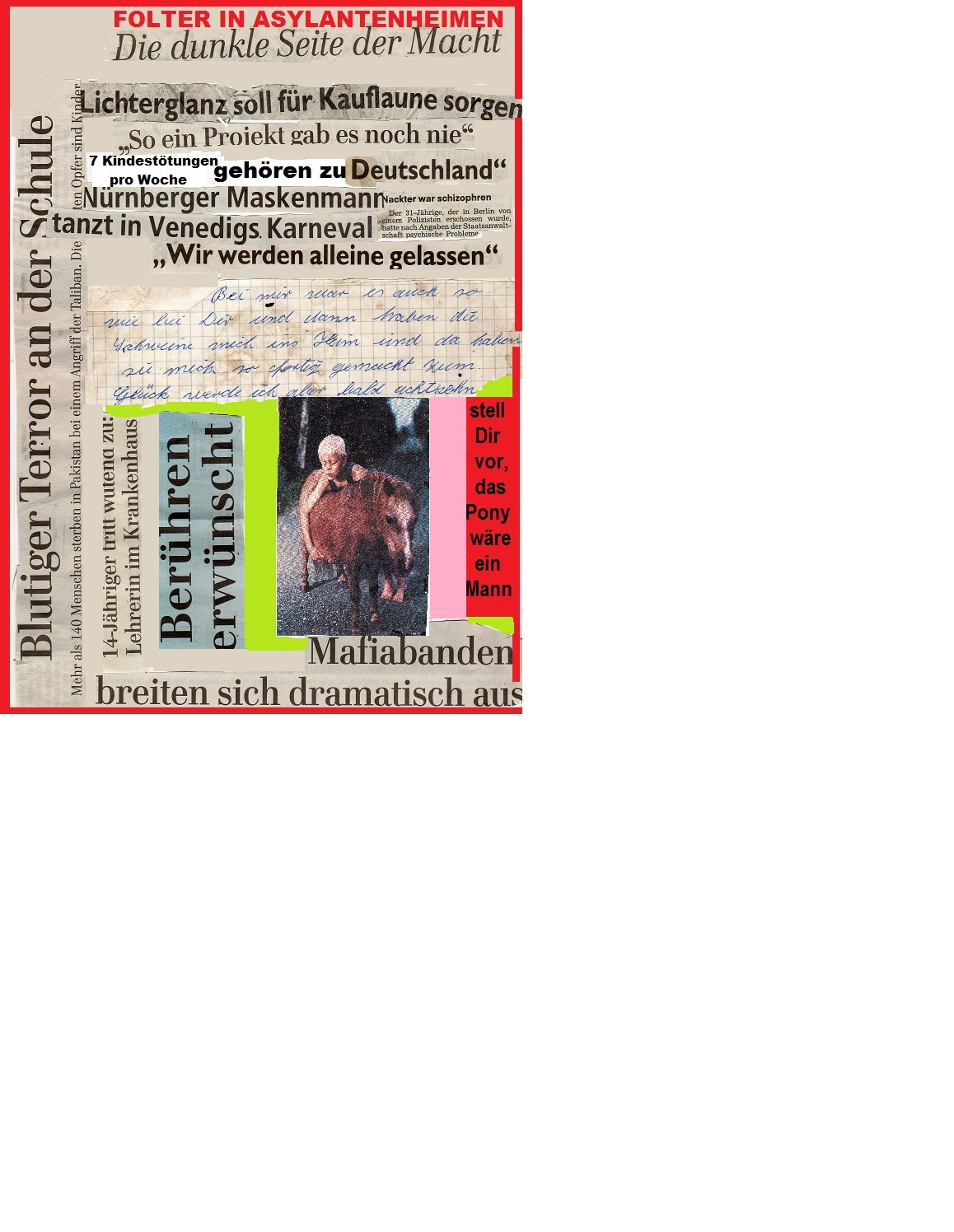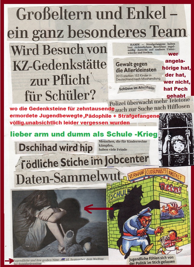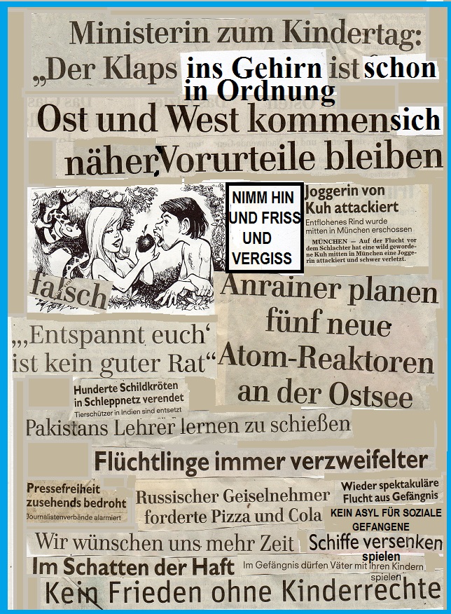 "Ja liebe Leute, wir sollten die Flüchtlinge aus den Erziehungsfolterkammern der Nation endlich an-erkennen. die Fehler, die wir in den vergangene Jahren und Jahrzehnten mit Flüchtlingen aus Heimen und Psychiatrien und anderen Sammellagern gemacht haben, sollten wir nämlich nicht wiederholen. Lassen wir sie also weiter, ich meine natürlich nicht, vielleicht noch viel heftiger und grausamer um ihr Leben vor den Auf-fangbehörden rennen bitte. Und noch etwas, liebe MitwürgerInnen und Mitwürger: Deutschland wird noch viel freiwilliges ehrenamtliches Engagement brauchen, um die vielen Flüchtenden bei ihrer Flucht aus Kinderheimen, Betreuerwillkür, Altenheimen, Jugendämtern, Asylantensammellagern, Psychiatrien und behinderten Werkstätten zu hindern, äh ich meine zu helfen und einen Platz zu schaffen, wo sie nach ihren Vorstellungen und Gefühlen leben können ohne Angst und Repression. Wenn das aber über Jahre und Jahrzehnte so weiter geht mit unserer Ignoranz und Kriminalisierung nach Paragraf 235, , wie wir das zum Beispiel auch gegenüber der Indianerkommune mit grossem Er-Folgen schon gemacht haben" ,"sagte sie, "wird das Land eines Tages an der Last der grossen Flüchtlingsströme aus deutschen Zwangseinrichtungen und oft auch pädagogischen Folterkammern ohne Zweifel zusammen brechen oder ab-saufen , je nachdem