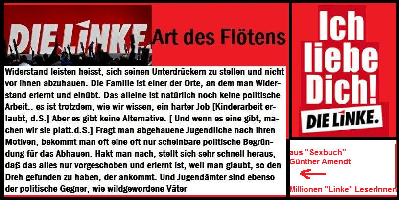 Die philen Menschen in Leib-zick, Drehstehn, Plaudern, Rohrstock, Eberswallung, Tittenberg, Wertfut, Hölle, Marterburg, Kotzpussi, Zwick-Au, Klausthalzellenfeld und Braun-Lage und so vielen anderen Orten der DORDR, begriffen allerdings erst dann den Sinn ihres kapitalismus-refreshenden Liebesverschweinigungsaufstands, als wir sie über eine Bewegung von halben Kindern und gevierteilten Jugendlichen in unserem wrestlich aufgeklärten Land berichteten, die damit drohten, sich jetzt auch jenseits aller Mauern auf die DORDR Gefühlslandschaften auszubreiten, und sich für gefährlich saufrichtigkeitsverliebte, hochkriminelle, perverse und asoziale Vereinigungspopptionen für den Frieden (mit) der Verwachsenenwelt einsetzten. Durch eine entsprechende , sie popolär machende Bulle_Wartpresse gefördert, wuchs natürlich die Lust auch der Kinder im Osten, sich in die Indianerkommune abzusetzen, denn: wer ist denn schon wertfrei "normal", wenn er es nicht muss? Und so kam in den nicht vorbelasteten, erfahrungsdefizitären straffen Behörden zur Observierung und Verfolgung des kinderrechtlichen Tagesgeschehens ein ungeheuer neuGIERIGEs, fast akribbel - biblisch aktiviertes klonfisch-zierendes Sammelbedürfnis von Nacktakten im Kopf staatstragender Säfte in Gang- natürlich aus rein beruflichen Gründen, und eine gleichzeitige durch unzählige Übergreiflichkeiten auf die rebbellierenden Minderjährigen geäusserte Umdeutungswut aus den Motiven einer gewissen nekrophilen Todessehnsucht, Selbstschussbedürftigkeit (siehe das Anwachsen der sie fast schon erstickenden Fluchtbewegungen heute) und einer verklemmten, klammheimlichen, inneren Phantasie- Erregung zu gunsten deutscher Kleiderkammern, Schokoladenliebe, bayrischer Negerküsse- und Gaskocherkulti-Virung zustande, so wurden einschlägige als ekelhaft definierte Bilder überhaupt erst vorstellbar und real, so konnte man die neuen bedenkenlos zum Grenzen Überschreiten Gewillten sehr effizient davor warnen, auf keinen Phall auf uns zu hören, und besser sich selbst darüber zu informieren, was wir als neue Buntländer über die schreckliche Kinderliebe NICHT erfahren und verbreiten dürfen, wie zum Beispiel, warum es einen dermassenen Hunger auf altersunabhängige und grenzenlose Formen von Liebe überhaupt gibt, und wie der Hunger auf das einzige Tabu, das uns GOTT sei dank noch bleibt, die Kinderliebe, sowohl mit dem Hunger auf Nahrung, dem Bedürfnis auf massenhafte Vollgefressenheit und dem Verhungern von Millionen Menschenskindern und der Ausbreitung des jugendamtlichen Staates (JS) auf dem gesamten Globus zusammen hängen. 50.000 neue Sozialarbeiter , 50.000 neue Polyzysten und Justizbebiemte, 50000 neue Leerer Hirnverheerer 50.0000 neue Kitazieher, NullkomaSex neue Psychiater, 50.0000 neue Verwaltungsangestellte, 500.000 neue Wohnungen, jede Menge neue Ärzte, na, wenn das nichts ankurbelt, triebhaft ankuppelt inbegriffen. WER also hat Interesse und verdient am Flüchtlingsstarkstrom? Wer setzt die Ausgebildeten, und Voreingebildeten ins Flugzeug, verteilt sie auf Europa und lässt die Unein-Gebildeten zu Hause und sterben? Ich begrüße daher heute auf unserer psychosexuellen Vereinigungsparty mit besonderer Schadens-Freude diejenigen EHE-malignen Abwesenden, da schon Massenermoderten unserer adultistisch-sattistischen Mainstream Gefühlswelten, insbesondere alle nicht eingeladenen Mami- und mumieficksierten Menschen unter uns, die damals schon nicht mehr dabei waren, sondern zum Glücklichwerden durch unser politisches, beckensteinigendes, psychiatrisches, Familien, Heim, Schule, Justiz- und Mediennetz erfolgreich zur Strecke gebracht werden konnten. Wir wären nicht da, an der Stelle meine ich, wo wir heute so wundervolles angespült bekommen und aus-gespüldet (gehörn gewaschen) sind, wenn wir sie damals nicht auf den Friedhof gebracht hätten, alle die also, die uns daran hintern wollten, wenigstens drei mal am Tag sich die Hände zu waschen, so blutig waren sie.