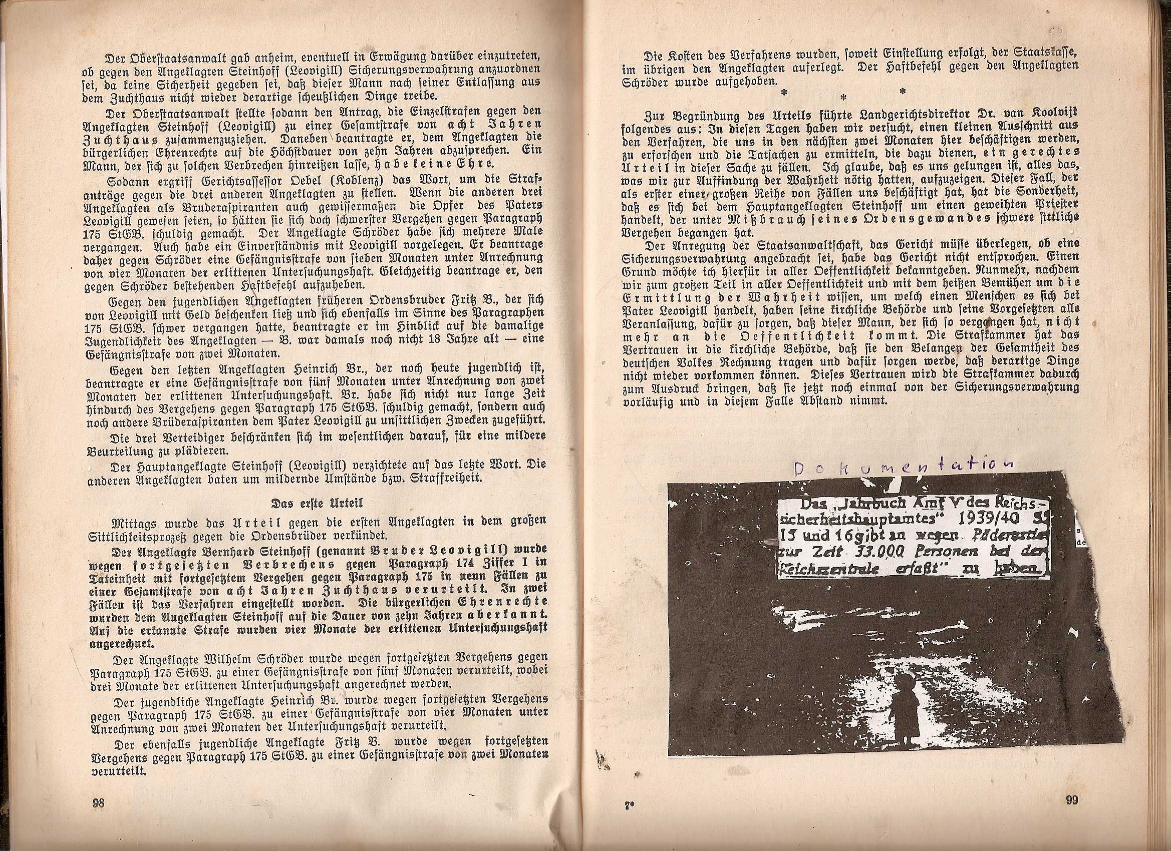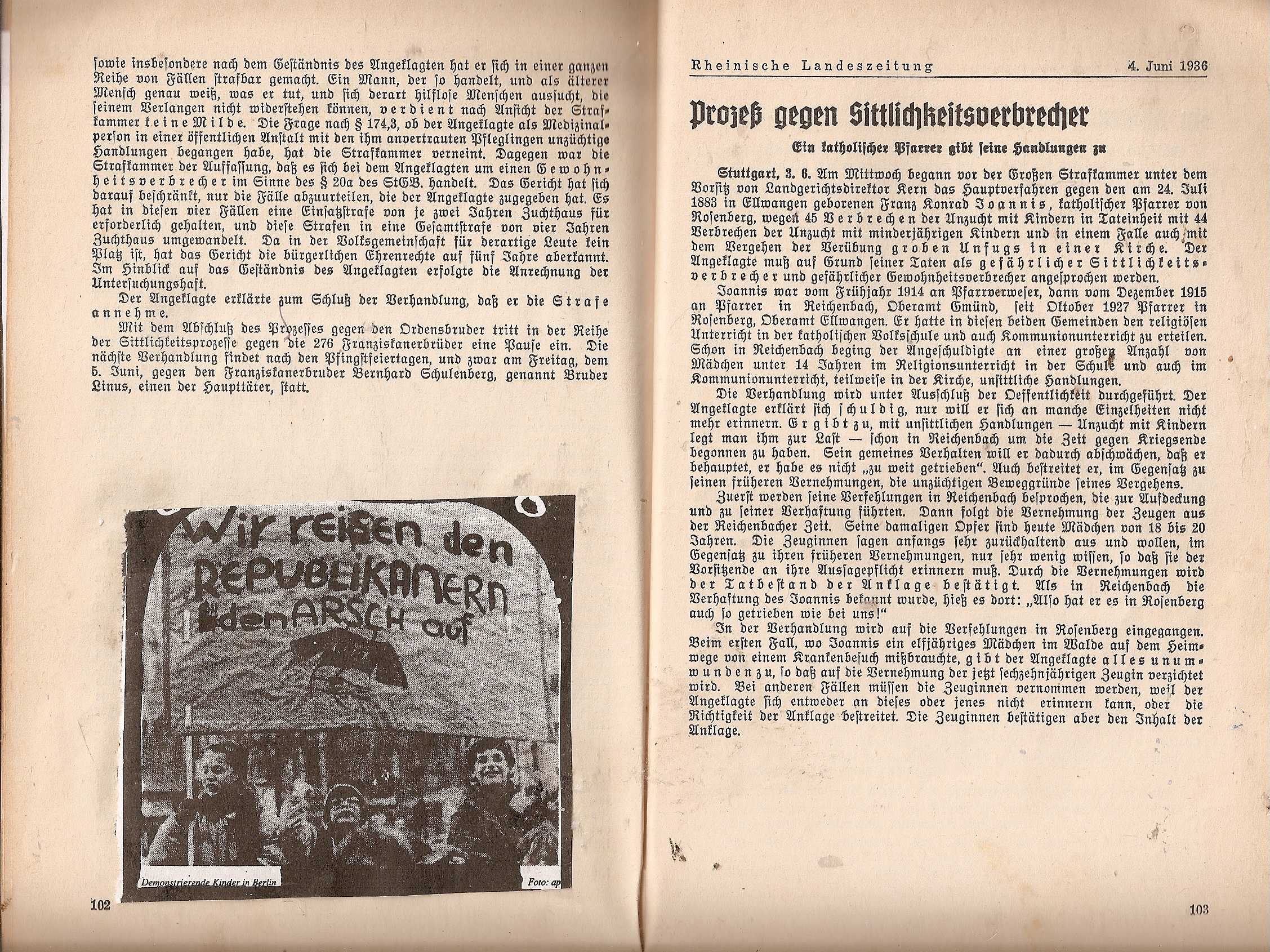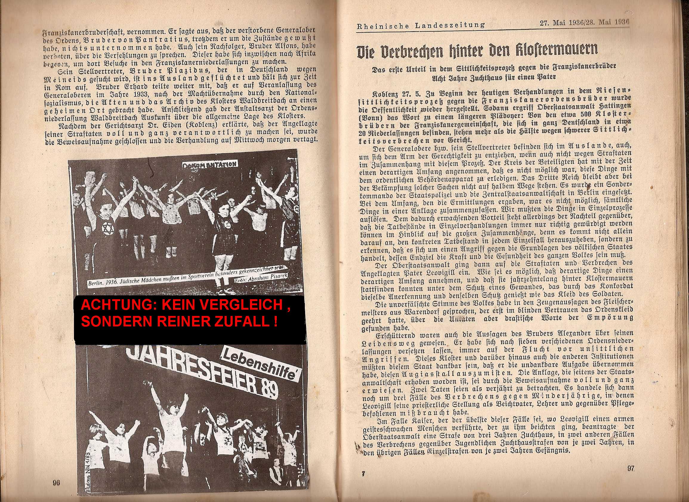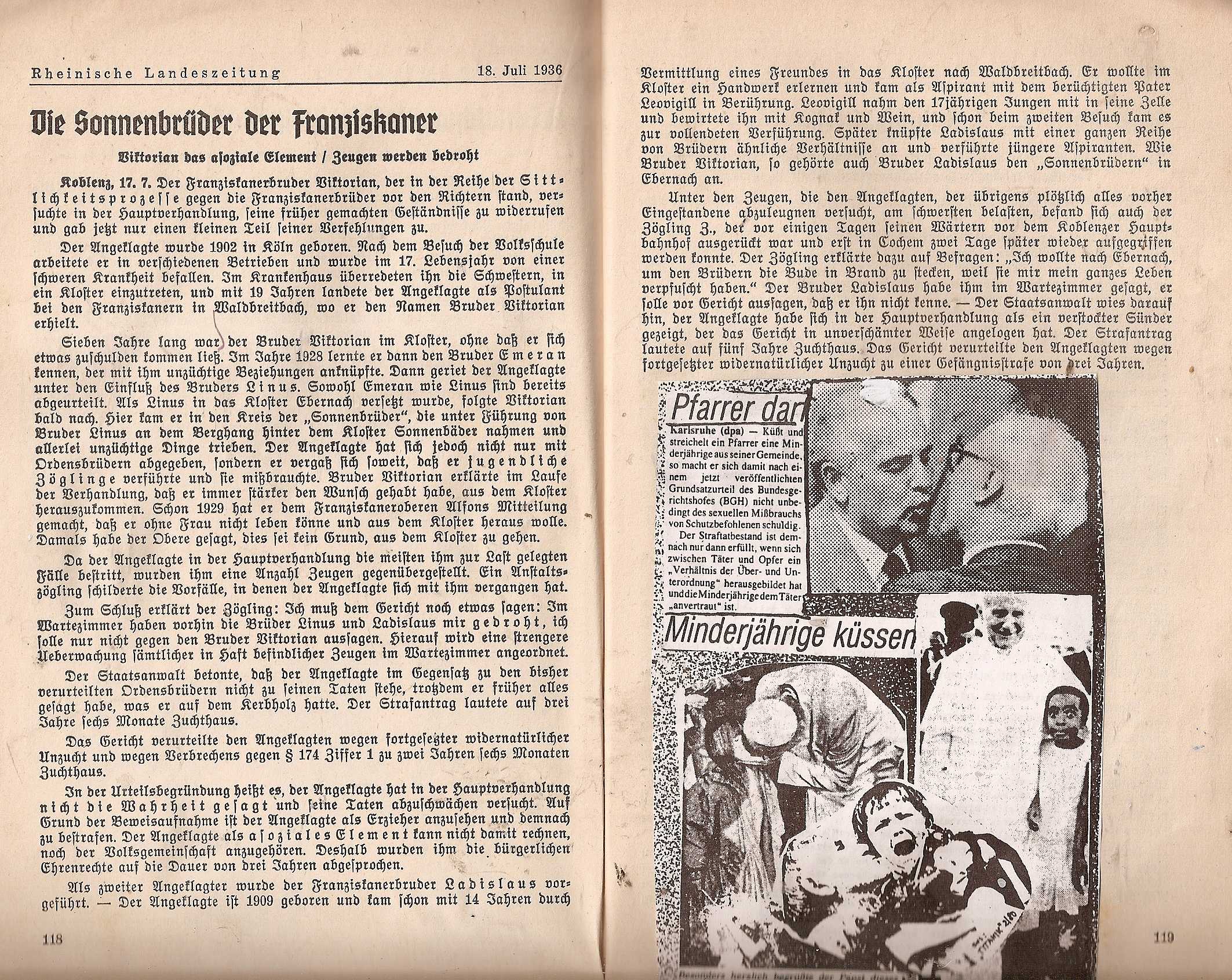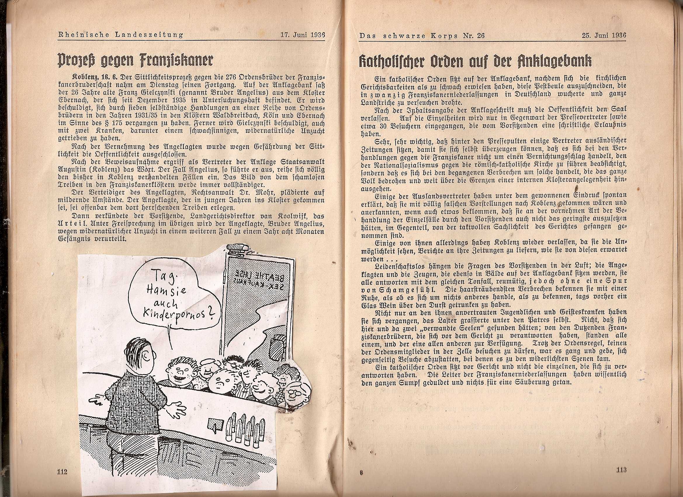 Nachfolgende Texte aus dem Dokument "an ihren Taten sollt Ihr sie erkennen" Zusatzbemerkung: es geht hier nicht darum, zu untersuchen, ob oder welche Teile z.B. der in diesem Dokument gebranntmarkten "Franziskaner" sich im politischen Widerstand befanden und ob oder welche mit den Nazis kolaborierten. Franziskaner waren ja angeblich AUCH Henker in den massenhaft entstehenden Konzentrationslagern (davon alleine neun Kinder-KZ). Im Vernichtungslager Jasenovac, wo über 200.000 Serben und Juden ermordet wurden, war der Franziskaner-Pater Filipovic offenbar zeitweise KZ-Kommandant; in dieser Zeit also wohl verantwortlich für 40.000 Morde gewesen. Man könnte auch spekulieren, ob sich dieser Mensch von seiner Verfolgung oder Vernichtung freikaufte, indem er an dem grausigen Geschehen teilnahm, aber da sollen die schlauen Historiker mal was zu sagen. Andererseits dürfte wohl ein Großteil der verurteilten Straftäter (?) auch in den KZs verschwunden sein. Samt ihren jüngeren Freunden, die man mit dem Etikett "sexuell pervers oder verwahrlost" oft genug ebenfalls in den KZs verschwinden ließ. Und da ging es um Menschen, die nach § 174, 175 und 176 verfolgt und verurteilt waren. Hier geht es nur darum, die Sprache kennen zu lernen, mit der damals wie heute ohne Rücksicht auf irgendwelche tatsächlichen" Qualitätsunterschiede" mit dem anliegenden Thema umgegangen wurde / wird, ob es eine historisch-hysterische Begriffs- und Emotionsschürungs- Kontinuität gibt oder nicht, mit den entsprechenden wohl in beiden Epochen sehr wohl sprachlich beabsichtigten massenpsychologischen Wirkungen und einem wie auch immer ganz sicher auch auf einem teilweisen durch Sprachungenauigkeit, Sprachverwirrung und verbaler Hysterisierung aufgebauten Vernichtungsfeldzug gegen die Objekte dieser Kampagnen. Und da spielt der eingebürgerlichte KINDERSCHÄNDERBEGRIFF eine herausragende Rolle.[/size]