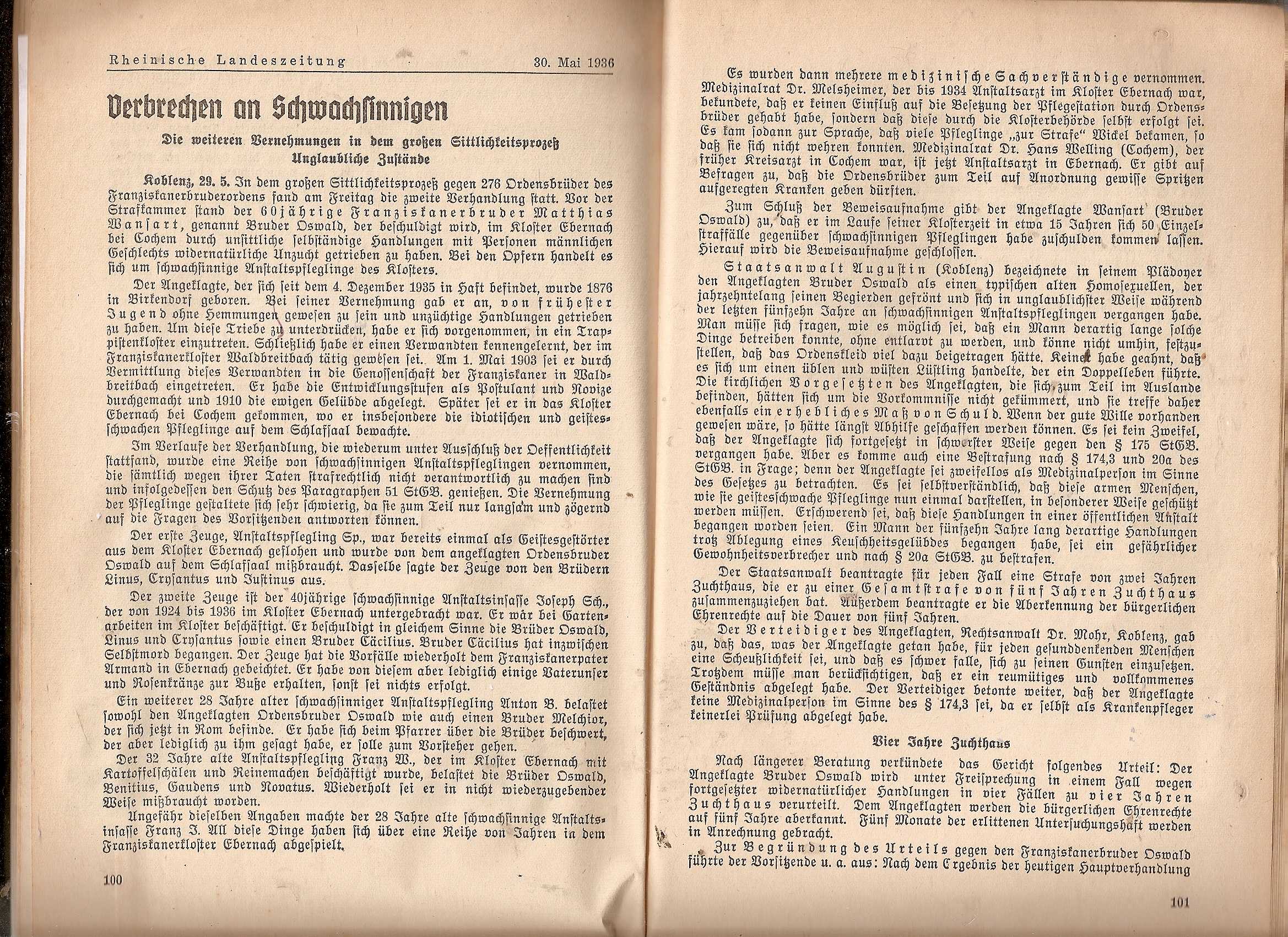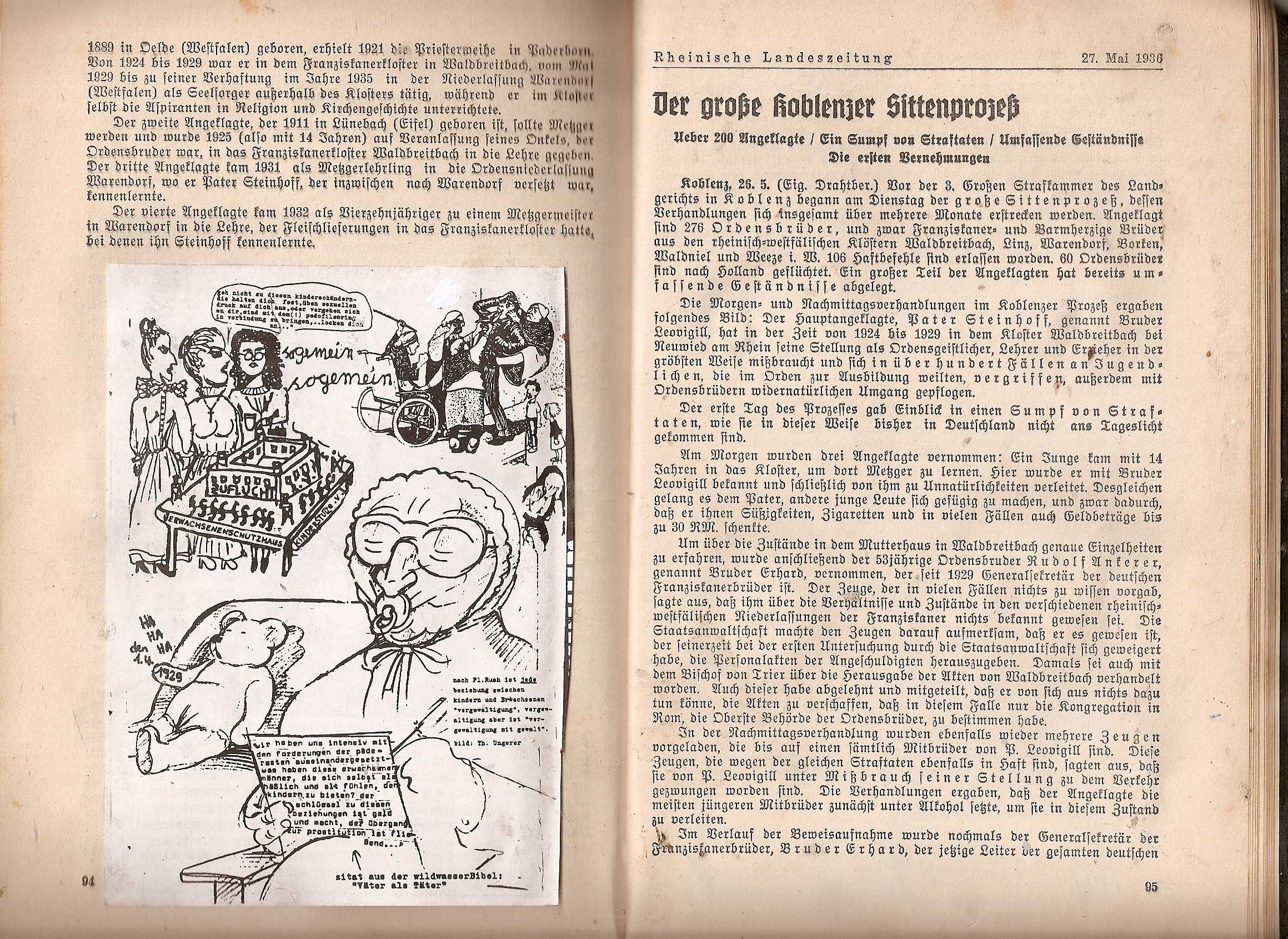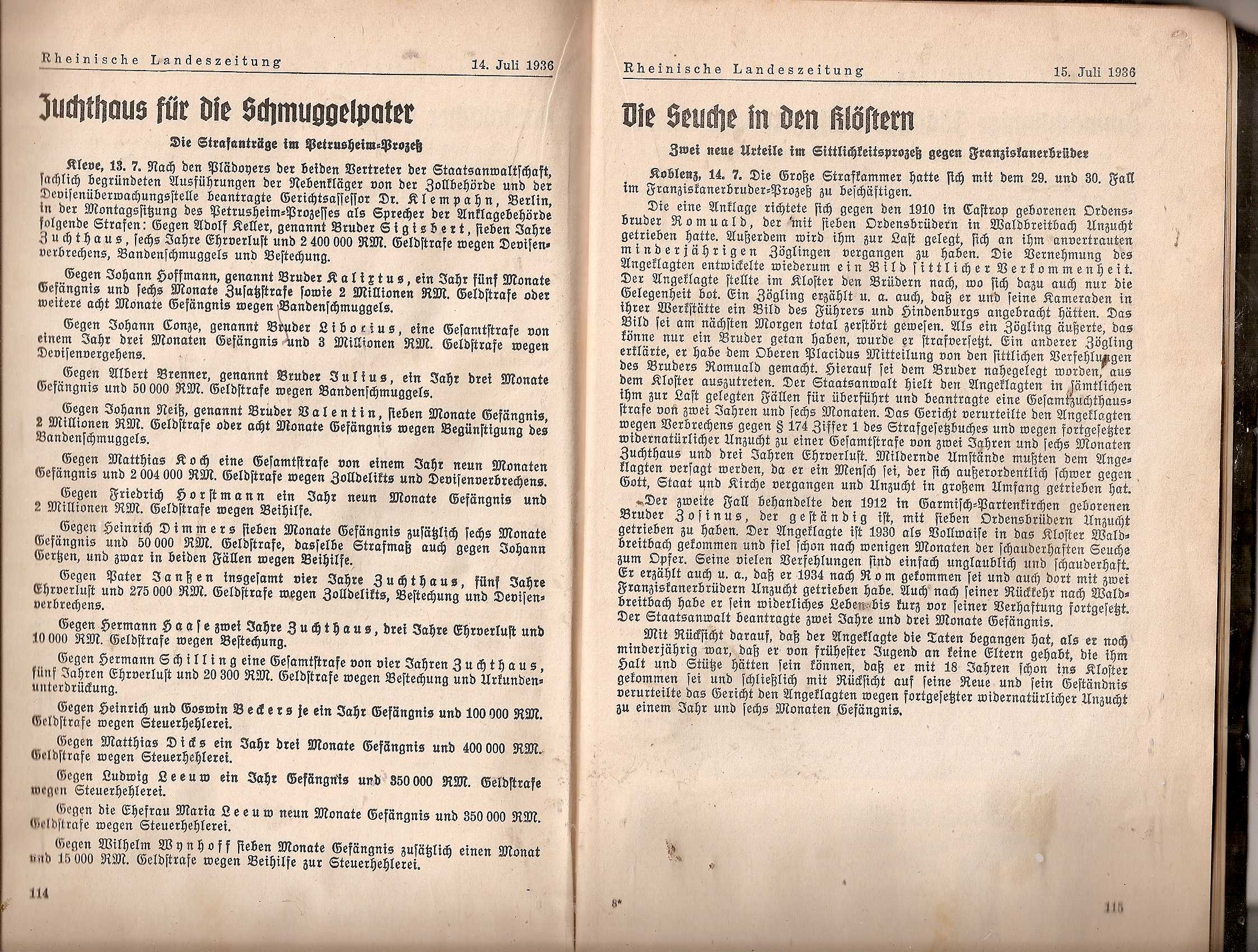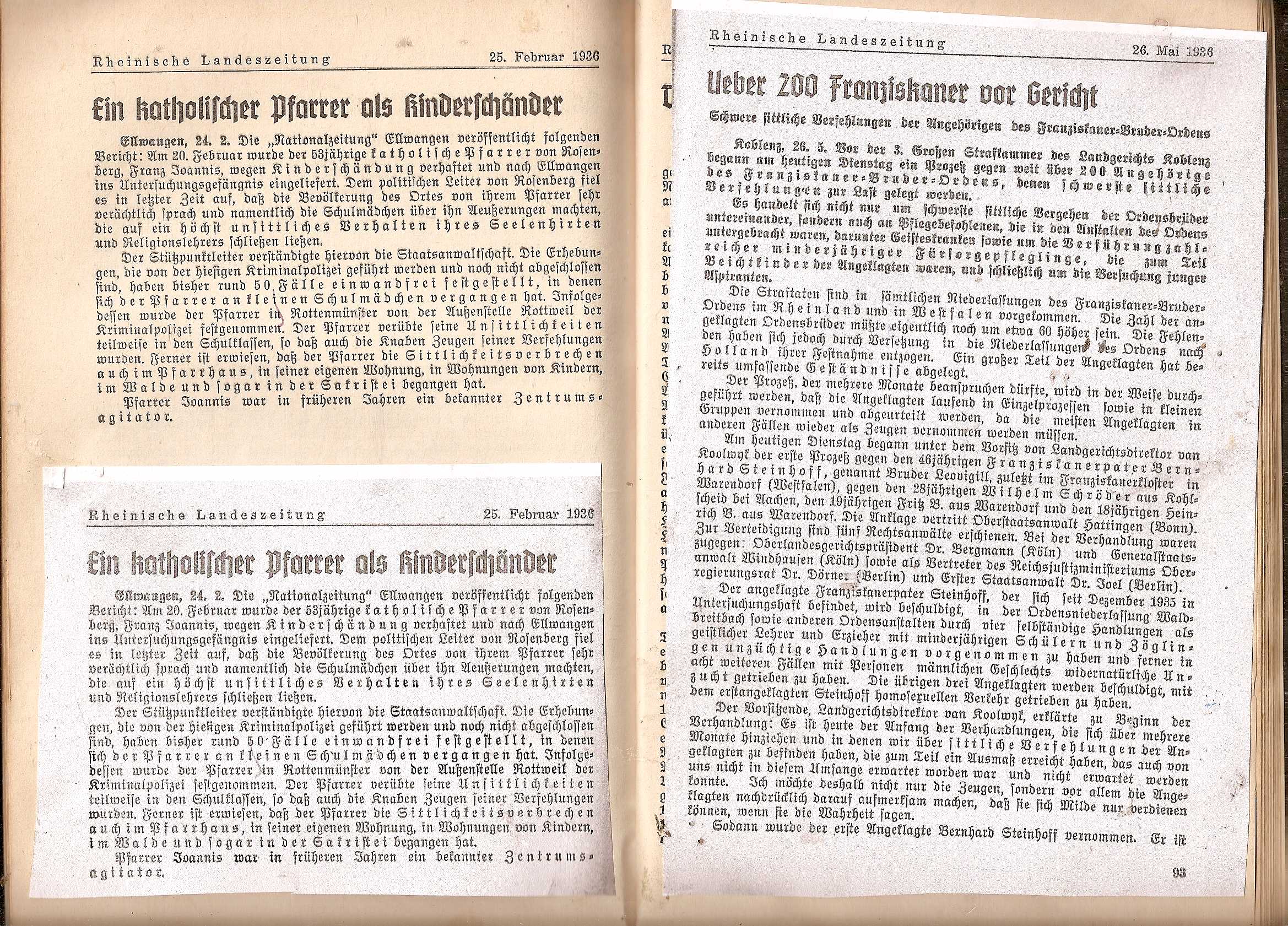 Nachfolgende Texte aus dem Dokument "an ihren Taten sollt Ihr sie erkennen" Zusatzbemerkung: es geht hier nicht darum, zu untersuchen, ob oder welche Teile z.B. der in diesem Dokument gebranntmarkten "Franziskaner" sich im politischen Widerstand befanden und ob oder welche mit den Nazis kolaborierten. Franziskaner waren ja angeblich AUCH Henker in den massenhaft entstehenden Konzentrationslagern (davon alleine neun Kinder-KZ). Im Vernichtungslager Jasenovac, wo über 200.000 Serben und Juden ermordet wurden, war der Franziskaner-Pater Filipovic offenbar zeitweise KZ-Kommandant; in dieser Zeit also wohl verantwortlich für 40.000 Morde gewesen. Man könnte auch spekulieren, ob sich dieser Mensch von seiner Verfolgung oder Vernichtung freikaufte, indem er an dem grausigen Geschehen teilnahm, aber da sollen die schlauen Historiker mal was zu sagen. Andererseits dürfte wohl ein Großteil der verurteilten Straftäter (?) auch in den KZs verschwunden sein. Samt ihren jüngeren Freunden, die man mit dem Etikett "sexuell pervers oder verwahrlost" oft genug ebenfalls in den KZs verschwinden ließ. Und da ging es um Menschen, die nach § 174, 175 und 176 verfolgt und verurteilt waren. Hier geht es nur darum, die Sprache kennen zu lernen, mit der damals wie heute ohne Rücksicht auf irgendwelche tatsächlichen" Qualitätsunterschiede" mit dem anliegenden Thema umgegangen wurde / wird, ob es eine historisch-hysterische Begriffs- und Emotionsschürungs- Kontinuität gibt oder nicht, mit den entsprechenden wohl in beiden Epochen sehr wohl sprachlich beabsichtigten massenpsychologischen Wirkungen und einem wie auch immer ganz sicher auch auf einem teilweisen durch Sprachungenauigkeit, Sprachverwirrung und verbaler Hysterisierung aufgebauten Vernichtungsfeldzug gegen die Objekte dieser Kampagnen. Und da spielt der eingebürgerlichte KINDERSCHÄNDERBEGRIFF eine herausragende Rolle.[/size]