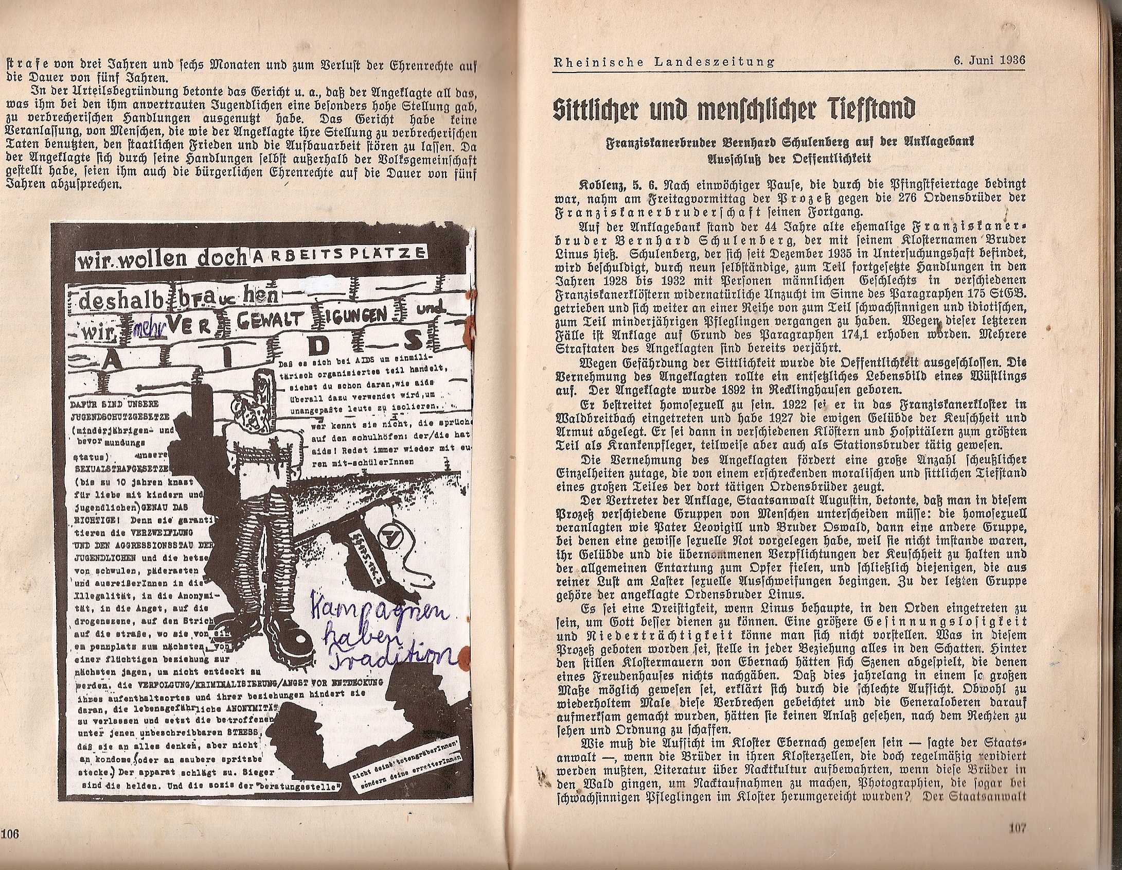 Ein Spirale scheint im Gange, die kaum noch aufzuhalten ist. Was die Herschenden in den letzten 30-40 Jahren an Definitionen, Missbrauchshysterie und Gesetzesverschärfungen geschaffen haben, dessen Resultate räumen die ganz Rechtsaussen dieses Staates nun voll ab. Diese Dokumentation möchte Anregung geben, nachzudenken über das Verhältnis damaliger NS- Kampagnen gegen bestimmte sexuelle, politische und weltanschauliche Minderheiten zu den heutigen sich immer mehr an die 3. Reich-Kampagnen annähernden Kampagnen. Wieviel Begriffsdiktatur, Denunziationen, Falschbeschuldigungen aus politischem Kalkül schon damals gegen den teilweise ANTIFASCHISTISCHEN Machtfaktor Kirche darunter waren (siehe Doku ganz unten) und sicherlich heute auch noch sind, lässt sich kaum ermitteln. Als ob "schuldige" kinder durchaus "§geschändet" werden dürften : mit diesen Kampagnen gegen die "Schändung "reinlicher", hilflos (gemacht)er Kinder" haben sie DAMALS a u c h weite Teile der oppositionell eingestellten Kirche, Jugendbewegung und anderen missliebigen Regimegegnern aus dem Weg geräumt. Heute natürlich nicht. Und da diese Gruppen nach wie vor gesellschaftlich verpönt und geächtet sind, gibts auch kaum Material aus der damaligen (und heutigen?) Zeit, das belegen könnte, wie brutal die Versuche waren, diese missliebigen Gruppen öffentlich zu denunzieren und zu vernichten. Aber wer es wissen will, deses forum bringt die dokumete. Die Qualität der vollig differenziert ablaufenden Fälle wurde und wird denn auch kaum untersucht, sondern pauschal unter den Hammer der "sittlichen Verwerfung" und : heutiger "Pädokriminalität" verurteilt. Wobei die wörtliche Übersetzung von dem neuen Zeitgeist- Begriff "Pädokriminalität" eigentlich "das kriminelle Kind" ist:( Pais=griech. das Kind) = oder "Kinderkriminalität ist" Womit also nicht nur die angebliche oder tatsächliche Veranlagung der Täter = gleichgesetzt mit einer Tat kriminalisiert wird, sondern auch wie an diesem Begriff deutlich zu erkennen ist, das Kind selbst als "kriminelles" Opfer oder sogar krimineller "Täter" und "Mittäter" wahrgenommen und mitbestraft wird. Und dann noch der Gipfel, wobei es den Sanktionstätern völlig egal ist, ob sich das Kind sexuell mißbraucht ("geschändet") fühlt oder nicht. Und falls "nein", kommt die Psychiatriemaschinerie in Gang, so lange, bis Du endlich sagst, "Ja, es war Missbrauch". Siehe auch andere Kulturen, wo das berührte oder vergewaltigte Kind oder die betreffenden Mädchen / Frauen eine "Schande" für die Familien bedeuten und aus dem Familienverband ausgeschlossen und die "Nestbeschmutzerinnen" oft sogar umgebracht werden